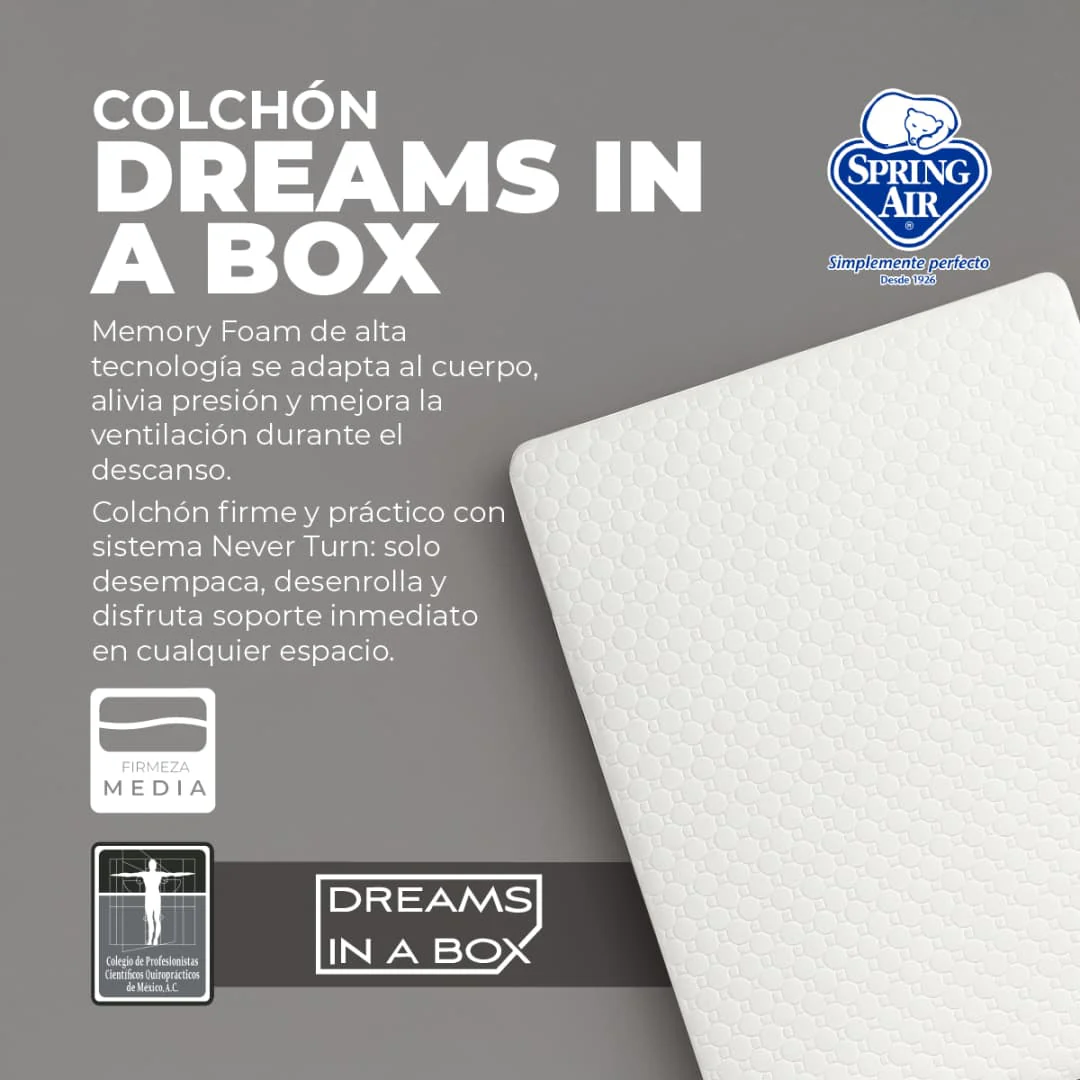 El colchón Dreams in a Box de Spring Air ofrece una experiencia de descanso suave, cómoda y práctica. Diseñado para quienes buscan confort con tecnología avanzada, su presentación compacta en caja lo hace fácil de transportar, instalar y disfrutar desde el primer día.